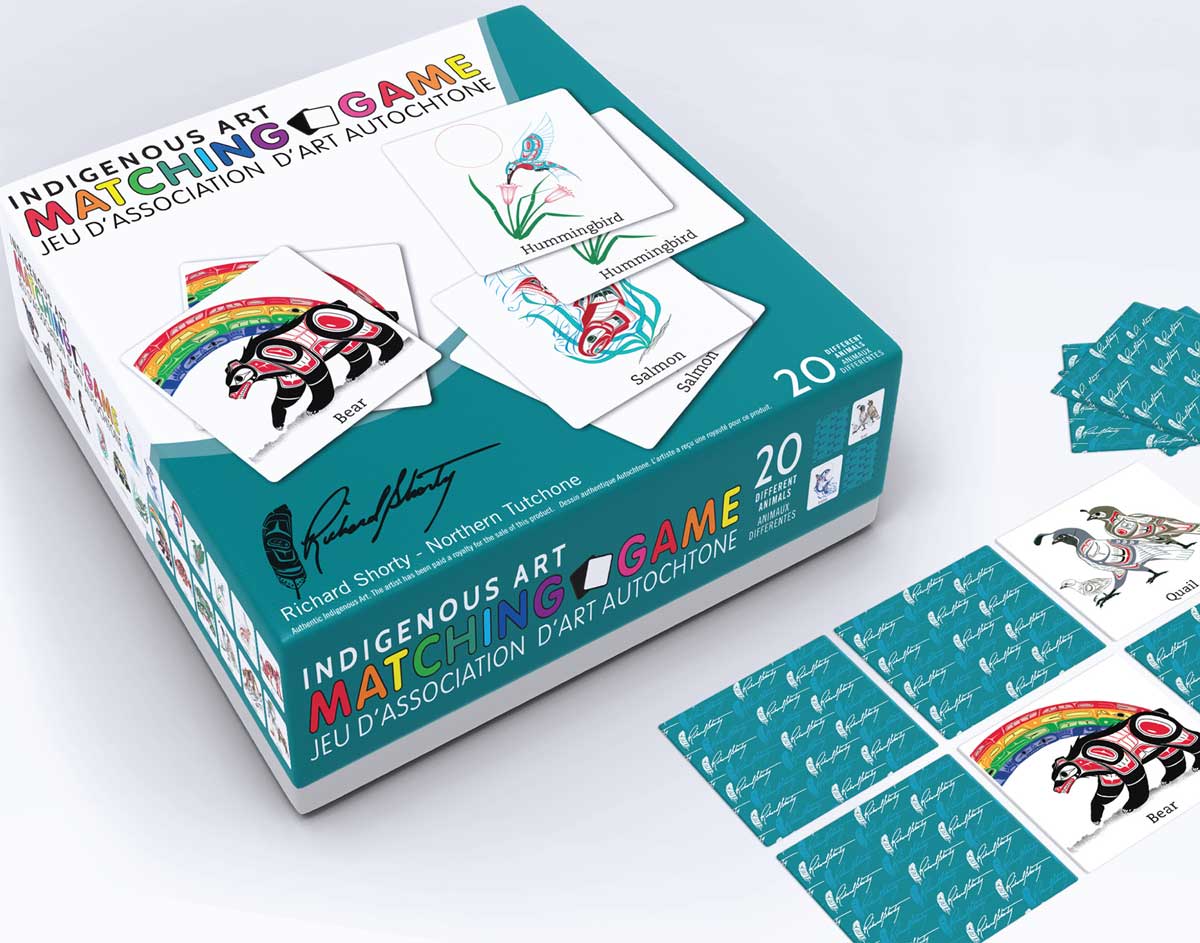 The Indigenous Art Matching Game includes 20 images (40 cardboard tiles) by Northern Tutchone artist, Richard Shorty. It is suitable for ages 2 and up and comes with the artist’s headshot and biography on the back of the box. Our collection of indigenous art games features authentic artwork by talented indigenous artists, offering a fun and educational experience for players of all ages.